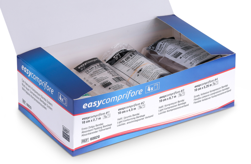 Easycomprifore Çok Katmanlı Sıkıştırma Bandaj Sistemleri, venöz bacak ülserlerinin ve ilişkili durumların tedavisi için kullanılır.